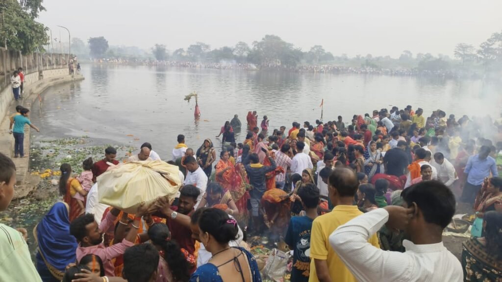बरदती तालाब, पंडित पोखर, बुर्जरबांध, जमुना बांध, राजा बांध, रानीसावर तालाब, शीतलदास तालाब और दामोदर नदी के तटों पर हजारों भक्तों ने अस्ताचलगामी सूर्य को अर्घ्य दिया। दृश्य अत्यंत भावुक और भक्तिमय था — जिनकी मनोकामनाएँ पूर्ण हुईं, ऐसे कई श्रद्धालु ‘दंडवत’ करते हुए अपने घरों से घाटों तक पहुँचे।