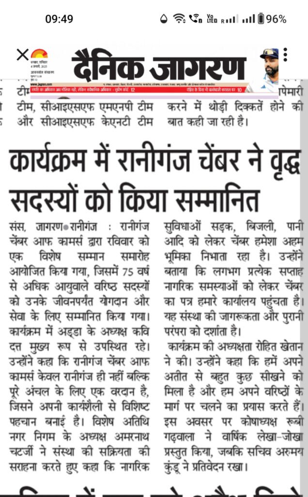 रानीगंज चेंबर ऑफ कॉमर्स द्वारा वरिष्ठ सदस्यों का सम्मान समारोह संपन्न